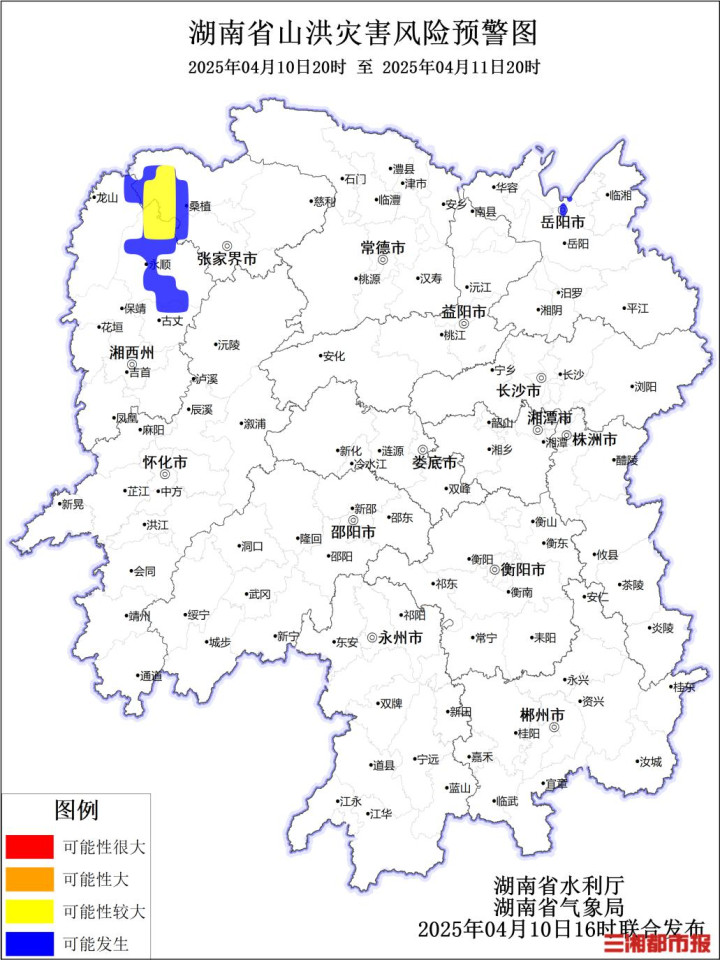 华声在线4月10日讯(全媒体记者李致远通讯员林城)根据湖南省气象局4月10日预报,省水利厅与省气象局联合会商得出如下结论:受降雨影响,10日20:00至11日20:00,张家界、湘西州局地发生山洪灾害的可能性较大,具体如下: